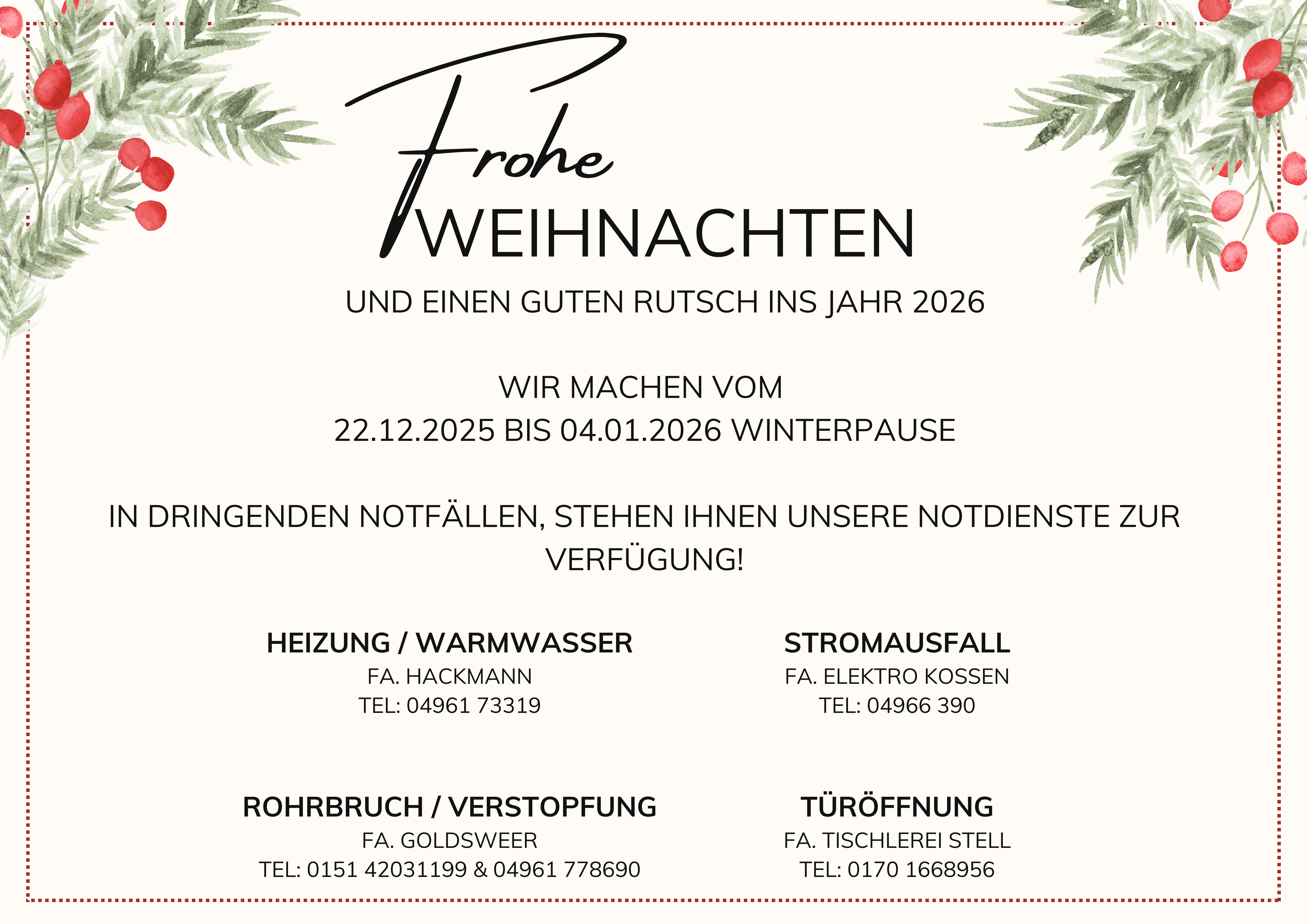 Vom 22.12.2025 bis einschließlich 04.01.2026, befinden wir uns im Betriebsurlaub. Ab dem 05.01.2026 stehen wir Ihnen wieder zu unseren regulären Öffnungszeiten zur Verfügung!